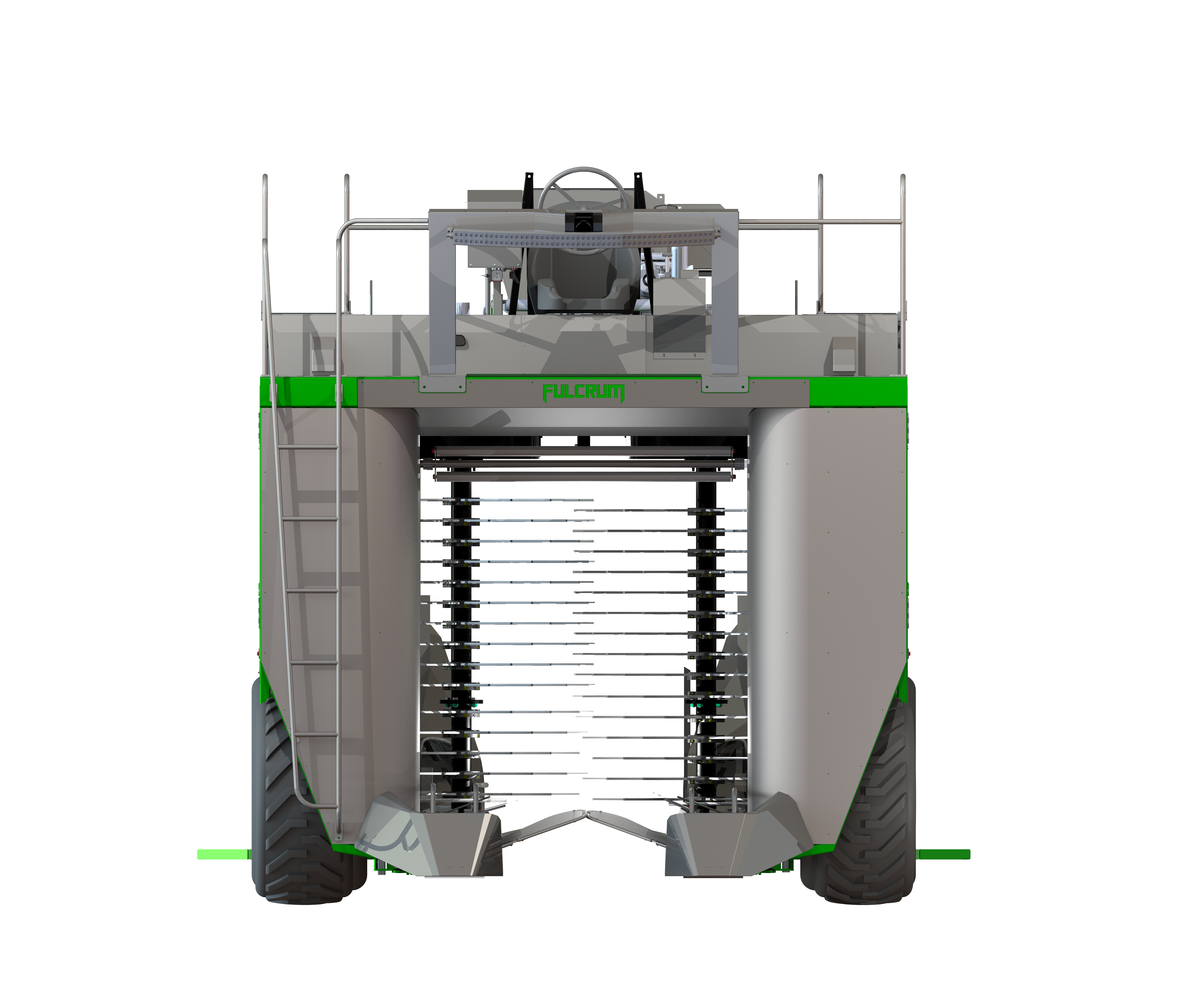 The Fulcrum is the most versatile Fresh Fruit Harvester available. It can transition from a horizontal picking position to a traditional vertical picking position. The 63” wide tunnel entry allows for longer picking fingers, which also enables the rotary heads to be further apart and pick larger bushes more effectively. Ordinary harvesters use hard plastic or metal to catch the berries, which can bruise the fruit. The Fulcrum, on the other hand, uses a sloped “No-Bruise” padded harvesting bed along with “No-Bruise” padded catcher plates. These features dramatically improve the look and increase the shelf life of your fruit.